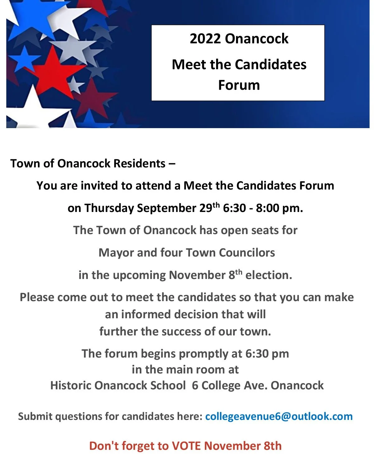 The Town of Onancock has open seats for Mayor and four Town Councilors in the upcoming November 8th election. Please come out to meet the candidates so that you can make an informed decision that will further the success of our town.